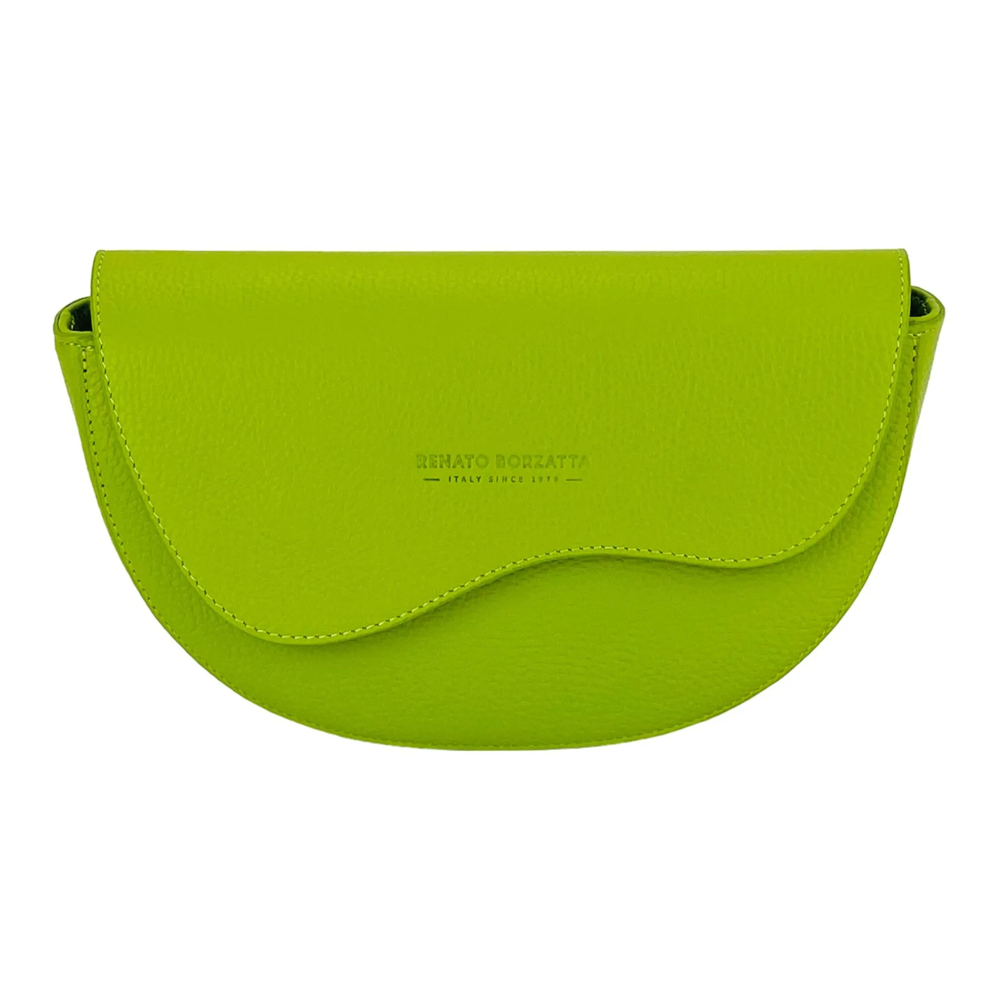 Die **abgerundete Umhängetasche für Damen** (Modell: RB1027AD) ist ein fröhlicher Farbtupfer und ein stilvoller Begleiter für sonnige Tage. Diese in Italien aus hochwertigem Echtleder gefertigte Tasche kombiniert ein modernes, minimalistisches Design mit praktischer Funktionalität in der leuchtenden Farbe „Lime“ (Limettengrün).