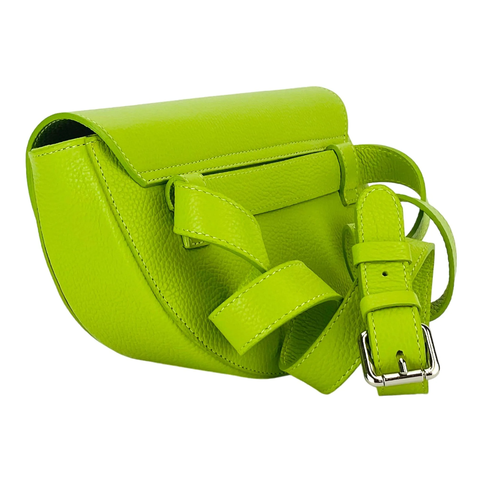Moderne, abgerundete Umhängetasche für Damen aus echtem Leder in leuchtendem Limettengrün (Made in Italy). Mit verstellbarem und abnehmbarem Gurt. Ideal für den Alltag.
