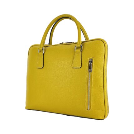Die **abgerundete Ledertasche** wird mit glänzenden, silberfarbenen Nickel-Accessoires veredelt, die einen modernen Akzent zum strahlenden Gelb setzen. Der Schultergurt aus Leder ist sowohl abnehmbar als auch in der Länge verstellbar, was vielseitige Tragemöglichkeiten erlaubt – ob kurz über der Schulter oder lang als Crossbody-Bag.