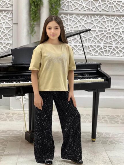 2-Piece Set for Girls – Glitter Shirt in Beige Black Palazzo Pants with Dots