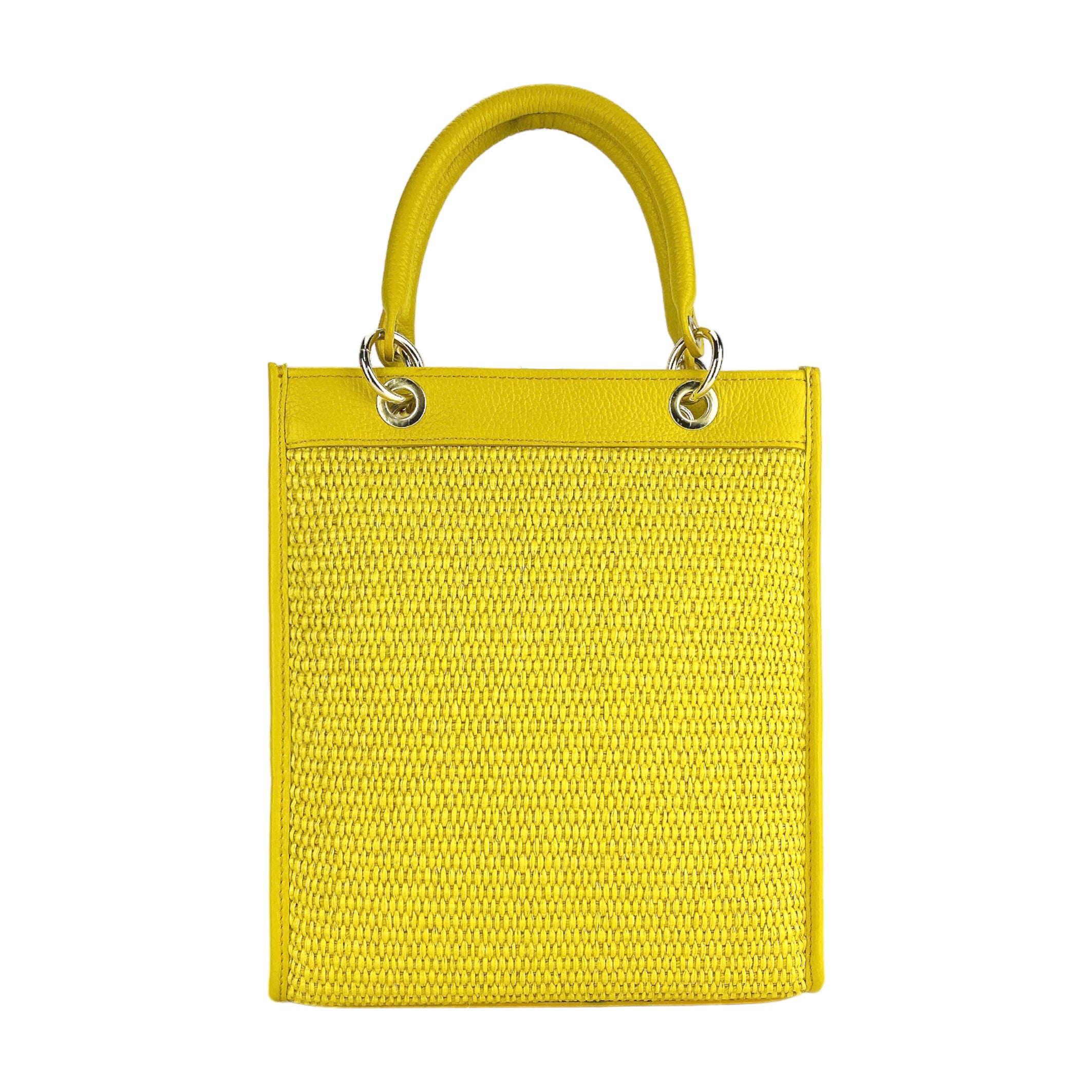 Unique vertical handbag made of a leather-straw combination in bright yellow (Made in Italy). Summery, elegant (24x29x9 cm) with gold details and detachable strap.